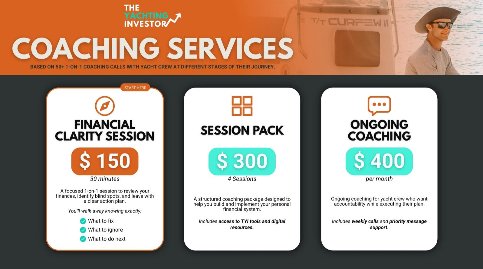 I help yacht crew replicate the exact system I used to build a serious financial launchpad.Since then, I’ve worked 1-on-1 with 50+ yacht crew members to help them build and implement their own financial systems.